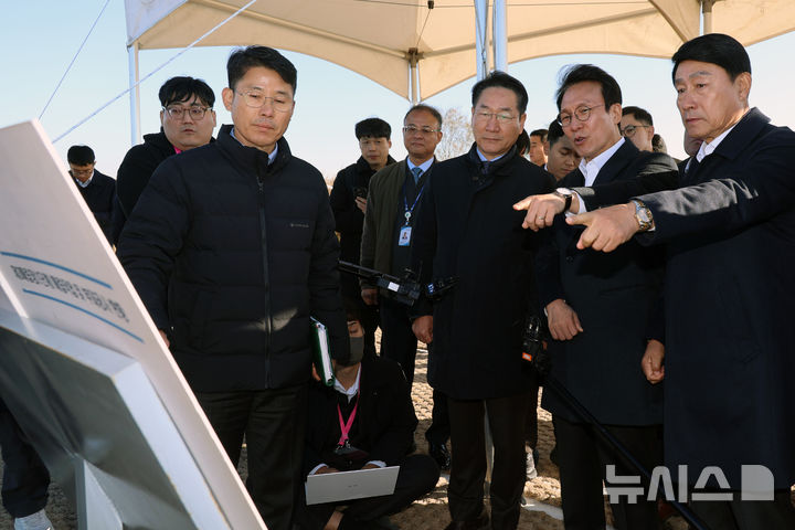 [인천=뉴시스] 청사사진기자단 = 김민석 국무총리가 21일 인천 서구 수도권매립지를 방문, 3-1매립장 위생매립 현황 및 2매립장 상부공간 활용대책에 대해 브리핑을 받으며 유정복 인천시장 및 참석자들과 대화하고 있다. 2025.11.21. [email protected]