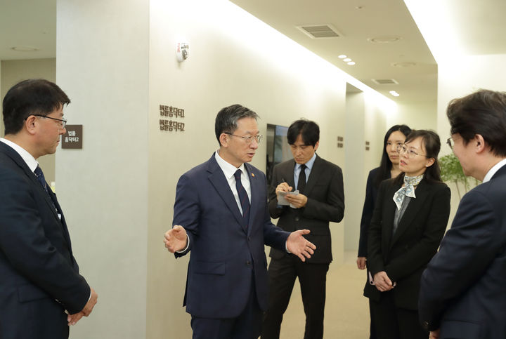 [서울=뉴시스] 황준선 기자 = 정성호 법무부 장관이 21일 서울 동작구 범죄피해자 원스톱 솔루션 센터를 방문해 현장을 점검하고 있다. (사진=법무부 제공) 2025.11.21. [email protected] *재판매 및 DB 금지