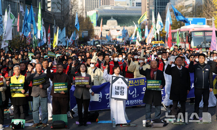[서울=뉴시스] 김선웅 기자 = 22일 서울 중구 세종대로에서 열린 2025 전국농민대회에서 참가자들이 농정대전환 실현, 기후재난 근본대책 마련, 농업예산 5% 확보, '농촌파괴'·'농민수탈' 에너지 정책 중단, 농지법 개악 중단, 나락값 보장, 개방농정 철폐 등을 촉구하고 있다. 2025.11.22. [email protected]