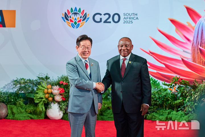 [요하네스버그=뉴시스] 최동준 기자 = 이재명 대통령이 22일(현지 시간) 남아프리카공화국 요하네스버그 엑스포 센터에서 열린 G20 정상회의에 앞서 시릴 라마포사 남아공 대통령과 악수를 하고 있다. (공동취재) 2025.11.22. [email protected]