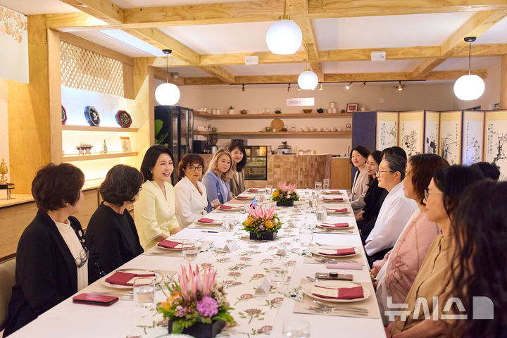 [요하네스버그=뉴시스] 최동준 기자 = 이재명 대통령과 함께 G20 정상회의 계기 남아프리카공화국을 방문 중인 김혜경 여사가 22일(현지 시간) 요하네스버그 소재 한식당에서 사회공헌과 문화교류 활동을 이어온 한인 여성들과 오찬 간담회를 하고 있다. (공동취재) 2025.11.23. [email protected]