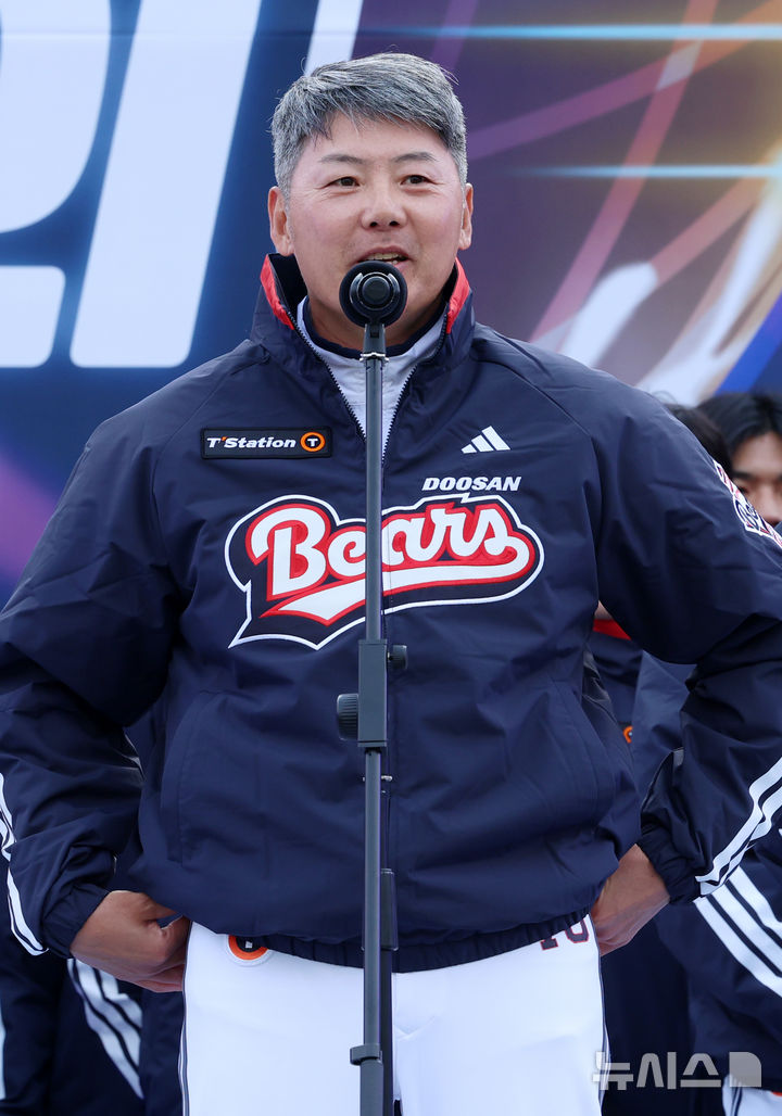 [서울=뉴시스] 조성우 기자 = 23일 서울 송파구 잠실야구장에서 열린 두산 베어스 팬 페스티벌 '곰들의 모임'에서 김원형 감독이 팬들에게 인사하고 있다. 2025.11.23. [email protected]