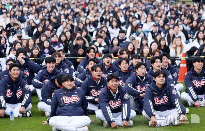 [서울=뉴시스] 조성우 기자 = 23일 서울 송파구 잠실야구장에서 열린 두산 베어스 팬 페스티벌 '곰들의 모임'에서 두산 선수단이 팬들과 즐거운 시간을 보내고 있다. 2025.11.23. [email protected]