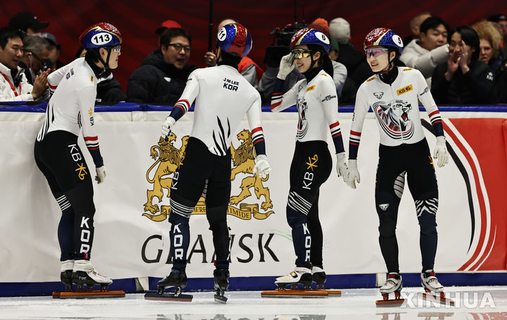 [그단스크=신화/뉴시스] 한국 남녀 쇼트트랙 선수들이 23일(현지 시간) 폴란드 그단스크의 할라 올리비아에서 열린 2025-26 국제빙상경기연맹(ISU) 쇼트트랙 월드투어 3차 혼성 2000m 결선 경기를 마치고 우승을 자축하고 있다. 김길리, 최민정, 이정민, 임종언이 출전한 한국은 2분40초155를 기록하며 금메달을 목에 걸었다. 2025.11.24.
