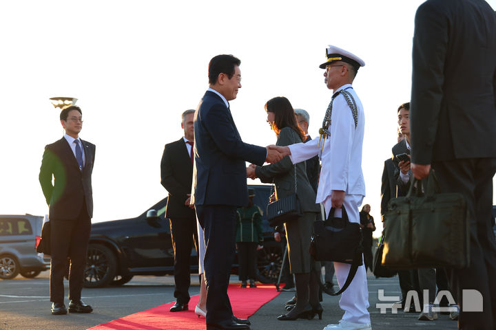 이재명 대통령, 튀르키예 출발 전 박철우 주남아공 해군무관과 악수