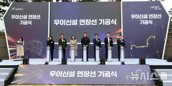[서울=뉴시스] 김혜진 기자 = 오세훈 서울시장이 24일 오전 서울 도봉구 방학사계광장에서 열린 우이신설 연장선 도시철도 건설공사 기공식에서 오언석 도봉구청장, 오기형 국회의원, 최호정 서울시의장을 비롯한 참석자들과 기념사진을 촬영하고 있다. 2025.11.24. [email protected]
