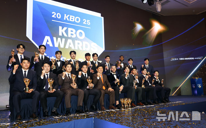 사진 왼쪽 위 시계 방향으로 KT 고영표(투수 부문 수비상), 삼성 구자욱(득점상), LG 박해민(도루상, 중견수 부문 수비상), 키움 송성문(3루수 부문 수비상), 한화 장규현(퓨처스 북부리그 타율상), KIA 이태양(퓨처스 승리상), 두산 홍성호(북부리그 타점상·홈런상), 삼성 디아즈(타자 부문 홈런, 타점, 장타율상·1루수 부문 수비상), KT 조이현(남부리그 투수 부문 평균자책점상, 승리상), 김정국 심판위원(심판상), 삼성 김성윤(우익수 부문 수비상), NC 김형준(포수 부문 수비상), NC 김주원(유격수 부문 수비상), LG 김주온(퓨처스 북부리그 평균자책점상), 한화 폰세(평균자책점, 승리, 탈삼진, 승률상·MVP), 허구연 KBO 총재, KT 안현민(신인상, 출루율상), KT 박영현(세이브상), 두산 양의지(타율상), SSG 노경은(홀드상). 2025.11.24. [email protected]