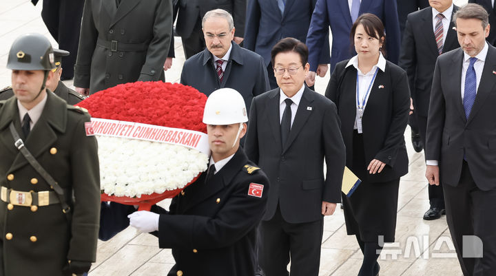 [앙카라=뉴시스] 최동준 기자 = 튀르키예를 국빈 방문 중인 이재명 대통령이 24일(현지 시간) 앙카라 아니트카비르에서 튀르키예의 국부 무스타파 케말 아타튀르크 묘소를 찾아 참배하기 위해 묘소 진입로인 '사자의 길'을 따라 이동하고 있다. 2025.11.24. [email protected]