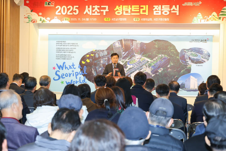 [서울=뉴시스] 전성수 서초구청장이 24일 서울 서초구청 광장에서 열린 2025 성탄 트리 점등식에 참석해 축사하고 있다. (사진=서초구 제공) 2025.11.25. [email protected] *재판매 및 DB 금지