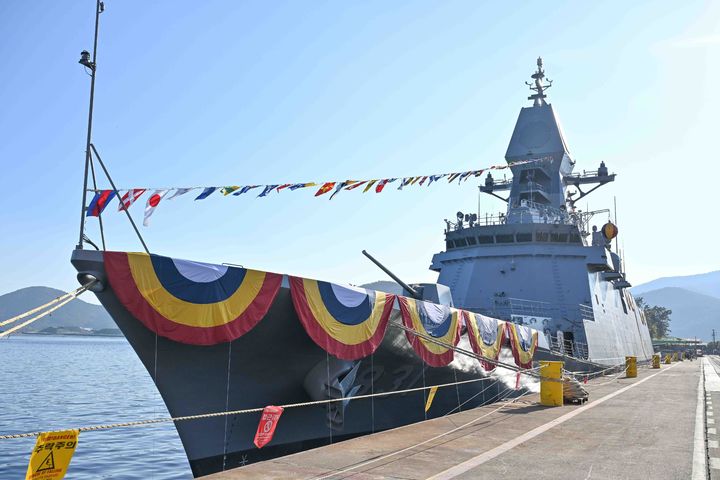[서울=뉴시스] 24일 경남 고성군 SK오션플랜트 안벽에 진수식을 앞둔 해군의 울산급 Batch-Ⅲ 3번함인 전남함(FFG, 3600톤급)이 정박되어 있다. (사진=해군 제공) 2025.11.25. [email protected] *재판매 및 DB 금지