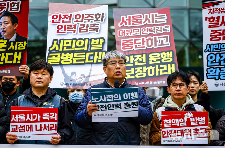 [서울=뉴시스] 정병혁 기자 = 김태균 서울교통공사노조 위원장이 25일 서울 중구 서울시청 앞에서 열린 서울교통공사노조 총파업 예고 기자회견에서 발언하고 있다. 2025.11.25. [email protected]