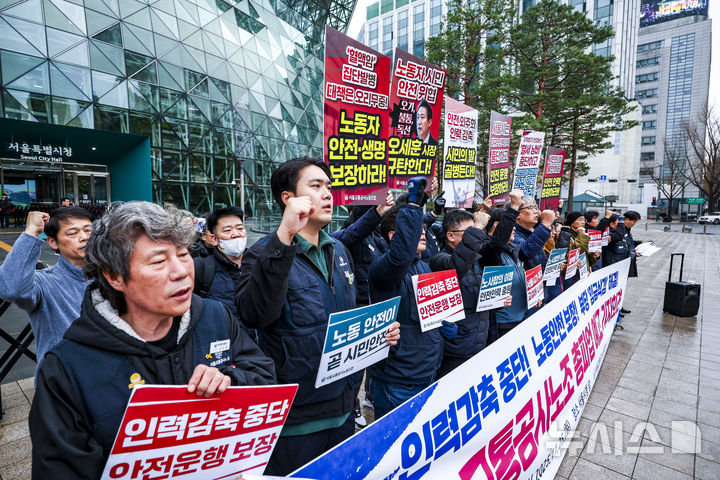 [서울=뉴시스] 정병혁 기자 = 25일 서울 중구 서울시청 앞에서 열린 서울교통공사노조 총파업 예고 기자회견에서 참가자들이 피켓을 들고 구호를 외치고 있다. 2025.11.25. [email protected]