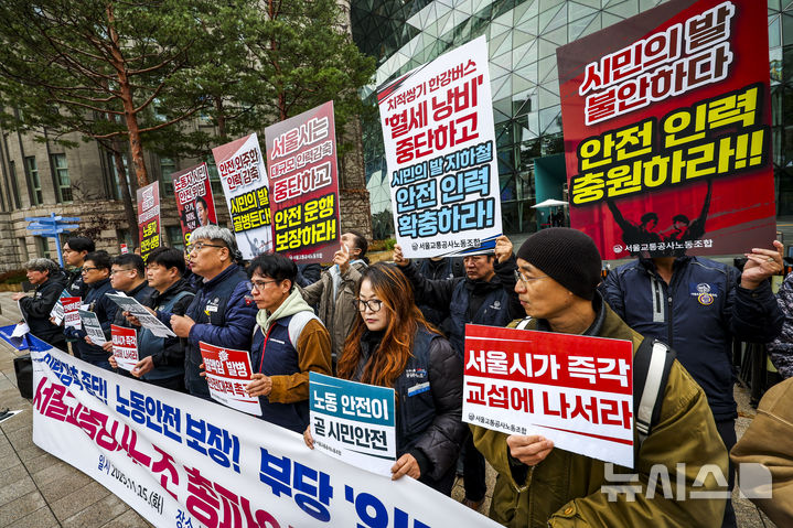 [서울=뉴시스] 정병혁 기자 = 25일 서울 중구 서울시청 앞에서 열린 서울교통공사노조 총파업 예고 기자회견에서 참가자들이 피켓을 들고 구호를 외치고 있다. 2025.11.25. [email protected]