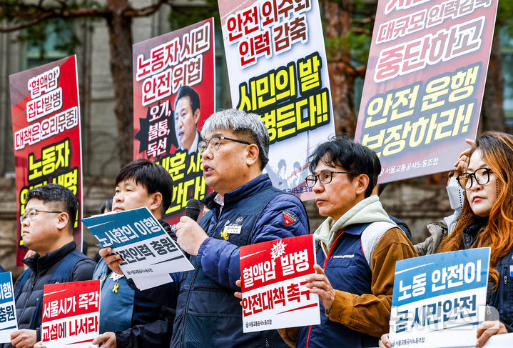 [서울=뉴시스] 정병혁 기자 = 김태균 서울교통공사노조 위원장이 25일 서울 중구 서울시청 앞에서 열린 서울교통공사노조 총파업 예고 기자회견에서 발언하고 있다. 2025.11.25. [email protected]