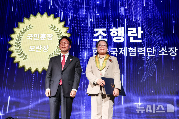 [서울=뉴시스] 정병혁 기자 = 김민석 국무총리가 25일 서울 중구 더플라자호텔 서울에서 열린 2025 개발협력의 날 기념식에서 조행란 한국국제협력단 소장에게 국민훈장 모란장을 수여한 뒤 기념촬영을 하고 있다. 2025.11.25. [email protected]