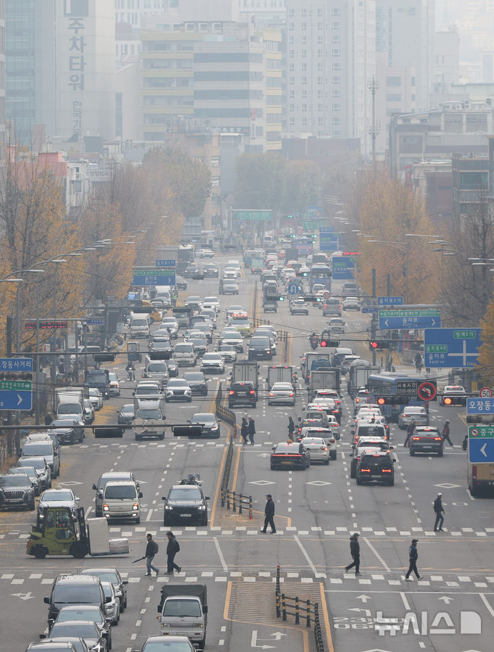 [서울=뉴시스] 황준선 기자 = 서울의 미세먼지와 초미세먼지 농도가 '나쁨' 수준을 보인 25일 서울 중구 동호로에서 바라본 도심이 뿌옇게 흐리다. 2025.11.25. [email protected]