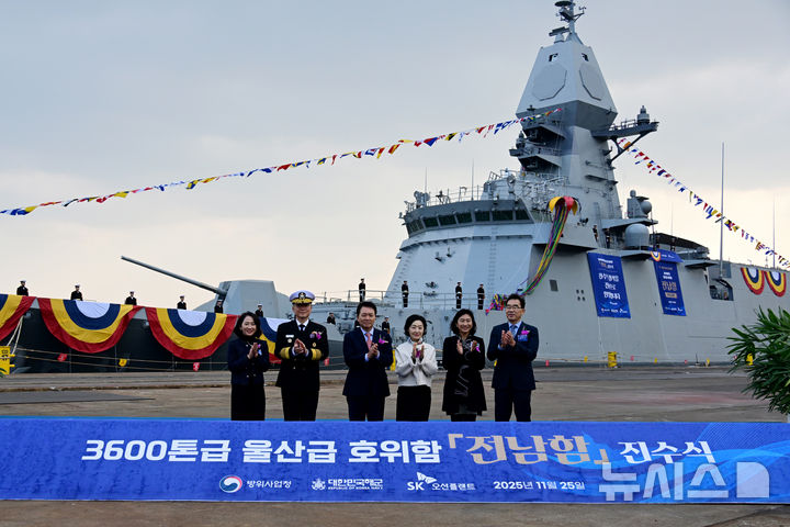 [고성=뉴시스] 차용현 기자 = 25일 오후 경남 고성군 소재 SK오션플랜트에서 열린 최신예 호위함인 울산급(Batch-Ⅲ) 3번함 전남함(3600t급)의 진수식에서 성일종 국회 국방위원장 내외, 강동길 해군참모총장 내외, 이승철 SK오션플랜트 대표이사 내외가 함정을 배경으로 기념촬영을 하고 있다. 2025.11.25. [email protected]