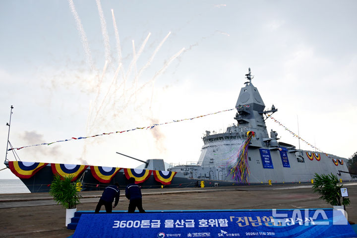 [고성=뉴시스] 차용현 기자 = 25일 오후 경남 고성군 소재 SK오션플랜트에서 최신예 호위함인 울산급(Batch-Ⅲ) 3번함 전남함(3600t급)의 진수식이 거행됐다. 2025.11.25. [email protected]
