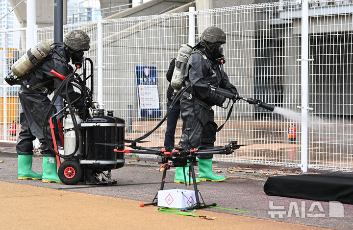 [수원=뉴시스] 김종택기자 = 25일 경기 수원월드컵경기장에서 인질·화학 테러 상황을 가정한 2025 경기남부 대테러 관계기관 합동훈련이 진행되고 있다.