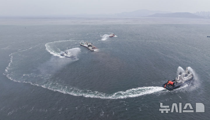 [서울=뉴시스] 전진환 기자 = 레디코리아 4차 훈련이 진행중인 25일 오후 인천 중구 인천연안여객터미널 앞 해상에서 선박 화재 진화 훈련이 진행되고 있다. (공동취재) 2025.11.25 [email protected]