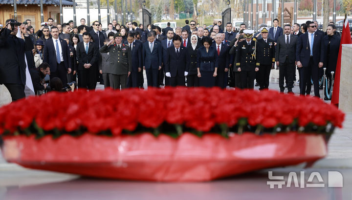 [앙카라=뉴시스] 최동준 기자 = 튀르키예를 국빈 방문 중인 이재명 대통령과 김혜경 여사가 25일(현지 시간) 앙카라 한국 공원에 위치한 한국전 참전 기념탑을 찾아 헌화 후 묵념하고 있다. 2025.11.25. [email protected]