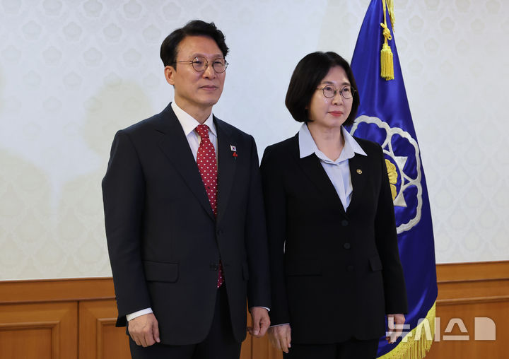 [서울=뉴시스] 김명원 기자 = 김민석 국무총리가 25일 서울 종로구 정부서울청사에서 열린 차관급 임명장 수여식에서 이미선 기상청장에게 임명장을 수여한 후 기념촬영을 하고 있다. 2025.11.25. [email protected]