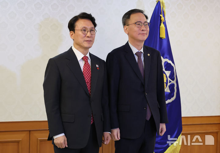 [서울=뉴시스] 김명원 기자 = 김민석 국무총리가 25일 서울 종로구 정부서울청사에서 열린 차관급 임명장 수여식에서 김영수 문화체육관광부 1차관에게 임명장을 수여한 후 기념촬영을 하고 있다. 2025.11.25. [email protected]