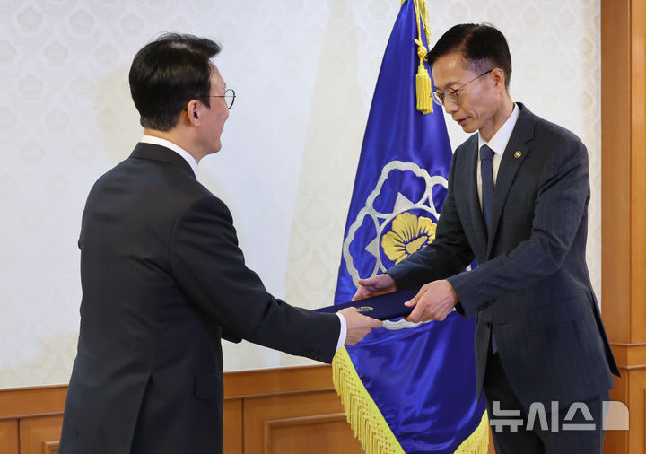 [서울=뉴시스] 김명원 기자 = 김민석 국무총리가 25일 서울 종로구 정부서울청사에서 열린 차관급 임명장 수여식에서 김용선 지식재산처장에게 임명장을 수여하고 있다. 2025.11.25. [email protected]