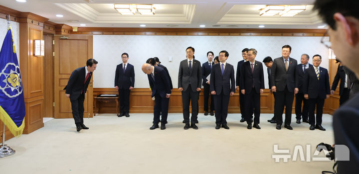 [서울=뉴시스] 김명원 기자 = 김민석 국무총리가 25일 서울 종로구 정부서울청사에서 열린 차관급 임명장 수여식에 참석하며 조원철 법제처장 등 참석자들과 인사하고 있다. 2025.11.25. [email protected]