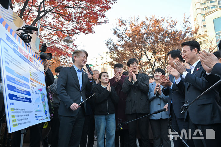 [광주=뉴시스] 김민석 국무총리가 26일 오후 광주 서구 동천동 골목상권을 방문해 김이강 서구청장으로부터 골목형상점가 지정 현황에 대한 설명을 듣고 있다. 서구는 전 지역을 골목형상점가로 지정하는 '골목경제 119프로젝트'로 국무총리상을 받은 바 있다. (사진=광주·전남사진기자단) 2025.11.26. [email protected]
