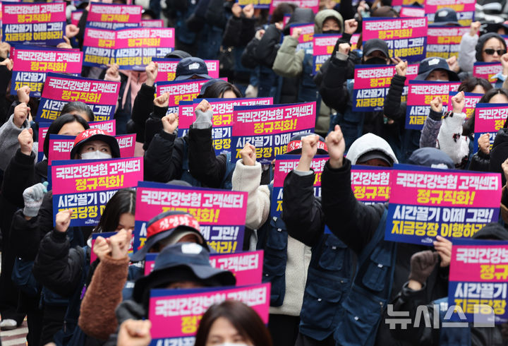 [서울=뉴시스] 배훈식 기자 = 민주노총 공공운수노조 국민건강보험고객센터지부 조합원들이 26일 오후 서울 중구 서울지방고용노동청 앞에서 제대로된 정규직 전환합의 즉각 이행을 촉구하며 총파업 결의대회를 하고 있다. 2025.11.26. [email protected]