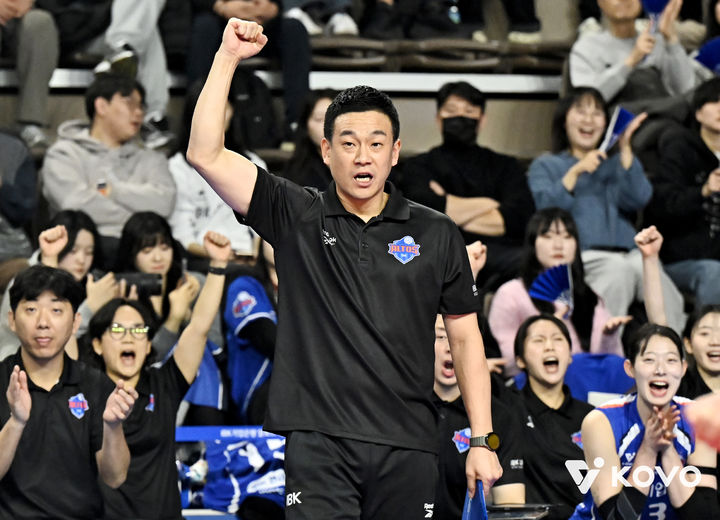 [서울=뉴시스] 조성우 기자 = 여오현 IBK기업은행 감독대행이 26일 경기도 화성종합실내체육관에서 열린 2025~2026 V-리그 여자부 흥국생명 핑크스파이더스와의 경기를 지켜보며 주먹을 불끈 쥐고 있다.