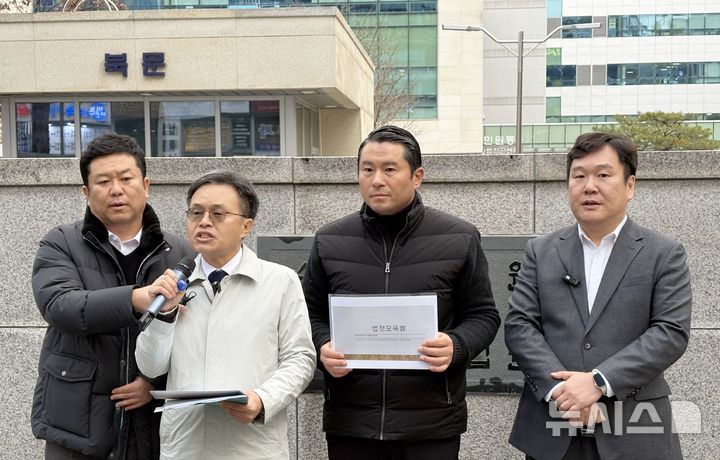 [수원=뉴시스] 변근아 기자 = 이화영 전 경기도 평화부지사 변호인단이 27일 경기 수원시 영통구 수원지방법원 앞에서 재판부 기피 신청을 한 뒤 퇴정한 검사 4명을 법정모욕 및 직무유기 혐의로 국가수사본부에 고발했다는 내용의 기자회견을 하고 있다. 2025.11.27. [email protected]