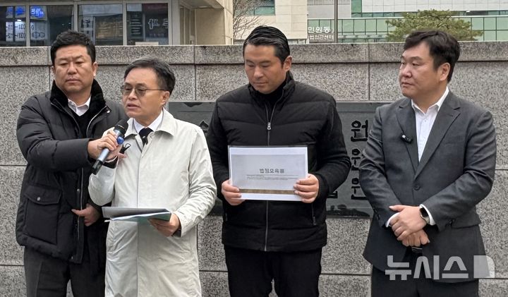 [수원=뉴시스] 변근아 기자 = 이화영 전 경기도 평화부지사 변호인단이 27일 경기 수원시 영통구 수원지방법원 앞에서 재판부 기피 신청을 한 뒤 퇴정한 검사 4명을 법정모욕 및 직무유기 혐의로 국가수사본부에 고발했다는 내용의 기자회견을 하고 있다. 2025.11.27. [email protected]