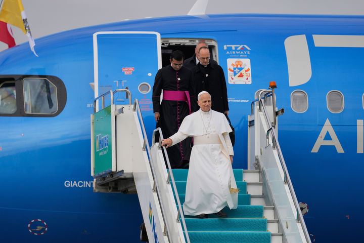 [앙카라(튀르키예)=AP/뉴시스]첫 해외 순방에 나선 레오 14세 교황이 27일 튀르키예 앙카라의 에센보가 국제공항에 도착, 비행기에서 내리고 있다. 그는 중요한 기독교 기념일을 기념하고, 우크라이나 전쟁을 종식시키고, 중동 긴장을 완화하기 위한 중요한 시기에 이 지역에 평화 메시지를 전달하려는 고 프란치스코 전 교황의 계획을 이행하기 위해 튀르키예를 찾았다. 2025.11.27.