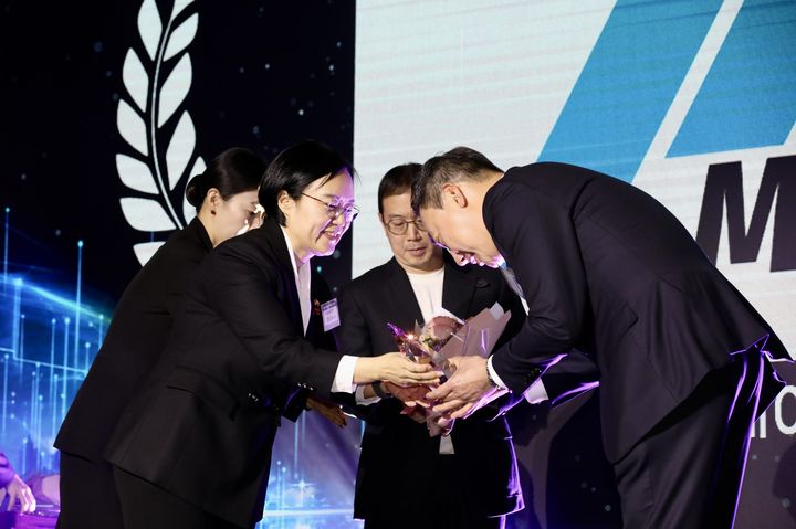 [서울=뉴시스] 한성숙 중소벤처기업부 장관이 27일 서울 서초구 엘타워에서 열린 2025 벤처천억기업 기념식에서 신규 벤처천억기업에게 트로피를 수여하고 있다. (사진=중소벤처기업부 제공) 2025.11.27. [email protected] *재판매 및 DB 금지
