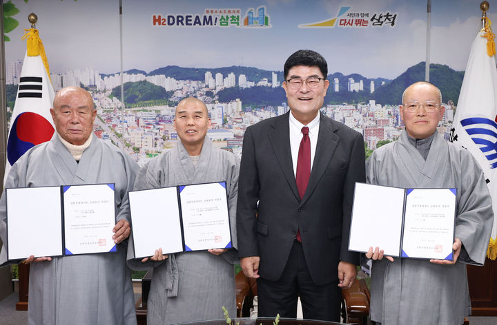 [삼척=뉴시스] 홍춘봉 기자 = 강원 삼척시는 28일 시장 집무실에서 박상수(오른쪽 두번째) 삼척시장이 신규 지정된 도지정 문화유산의 지정서 전달식을 진행하고 있다. 지난달 21일 ‘삼척 영은사 석조비로자나삼불좌상’, ‘삼척 신흥사 석조석가여래삼존좌상’이 유형문화유산으로, ‘삼척 감로사 원당도’가 문화유산자료로 각각 지정된바 있다.(사진=삼척시 제공)[email protected]
