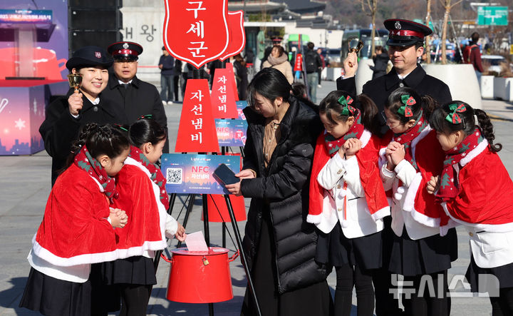 [서울=뉴시스] 추상철 기자 = 28일 오전 서울 종로구 광화문광장에서 열린 '2025 구세군 자선냄비 시종식'에서 서울 주니어 합창단 어린이와 학부모가 현금 및 NFC 자선냄비 모금 시연을 하고 있다. 2025.11.28. [email protected]