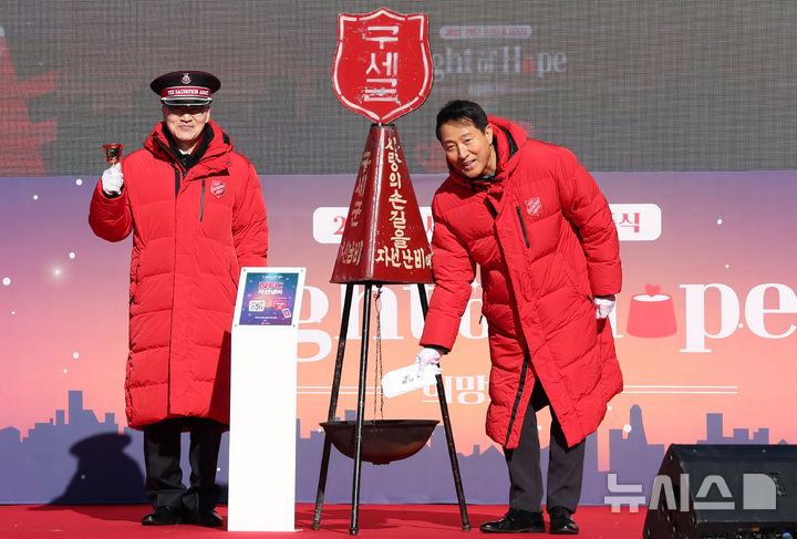 [서울=뉴시스] 추상철 기자 = 오세훈 서울시장이 28일 오전 서울 종로구 광화문광장에서 열린 '2025 구세군 자선냄비 시종식'에서 모금에 동참하고 있다. 2025.11.28. [email protected]