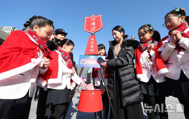 [서울=뉴시스] 추상철 기자 = 28일 오전 서울 종로구 광화문광장에서 열린 '2025 구세군 자선냄비 시종식'에서 서울 주니어 합창단 어린이와 학부모가 현금 및 NFC 자선냄비 모금 시연을 하고 있다. (공동취재) 2025.11.28. [email protected]