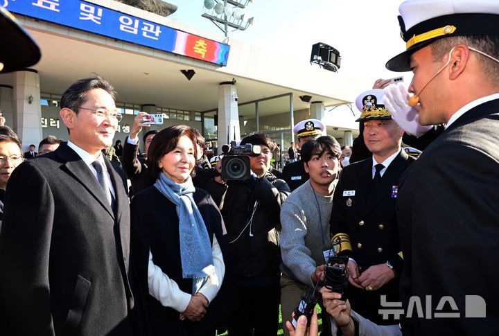 [창원=뉴시스] 차용현 기자 = 이재용 삼성전자 회장과 홍라희 전 삼성미술관 리움 관장이 28일 오후 경남 창원 해군사관학교 연병장에서 열린 제139기 해군·해병대 사관후보생 수료 및 임관식에 참석해 장남 이지호 소위로부터 경례를 받고 있다. (공동취재) 2025.11.28. [email protected]