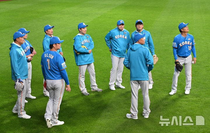 [서울=뉴시스] 사진공동취재단 = 29일 한국과 일본의 프로야구 은퇴 선수 친선 경기인 '한일 드림 플레이어즈 게임'이 열릴 일본 에스콘필드 홋카이도에서 한국 선수들이 대화하고 있다. 2025.11.29. [email protected]