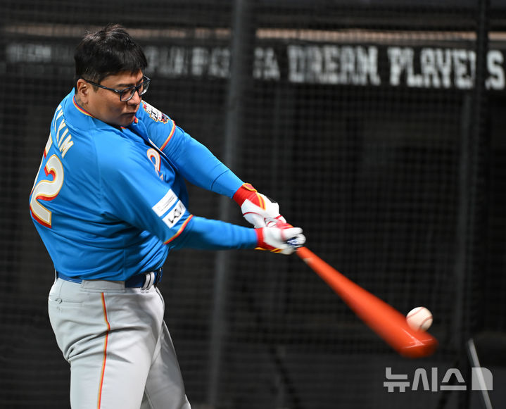[서울=뉴시스] 사진공동취재단 = 29일 한국과 일본의 프로야구 은퇴 선수 친선 경기인 '한일 드림 플레이어즈 게임'이 열릴 일본 에스콘필드 홋카이도에서 김태균이 훈련하고 있다. 2025.11.29. [email protected]