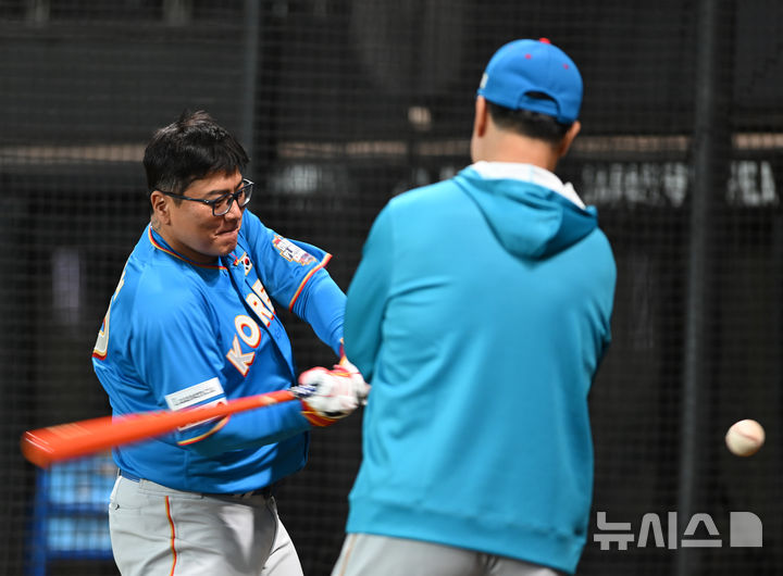 [서울=뉴시스] 사진공동취재단 = 29일 한국과 일본의 프로야구 은퇴 선수 친선 경기인 '한일 드림 플레이어즈 게임'이 열릴 일본 에스콘필드 홋카이도에서 김태균이 훈련하고 있다. 2025.11.29. [email protected]