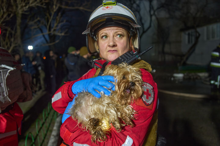 [비슈호로드=AP/뉴시스] 30일(현지 시간) 우크라이나 키이우 인근 비슈호로드의 한 아파트 건물이 러시아군의 미사일 공격을 받은 뒤 구조대원이 개 한 마리를 구조해 안고 있다. 현지 당국은 키이우 일대에서 밤새 이어진 러시아의 공습으로 최소 3명이 사망하고 30여 명이 부상했다고 밝혔다. 2025.11.30.