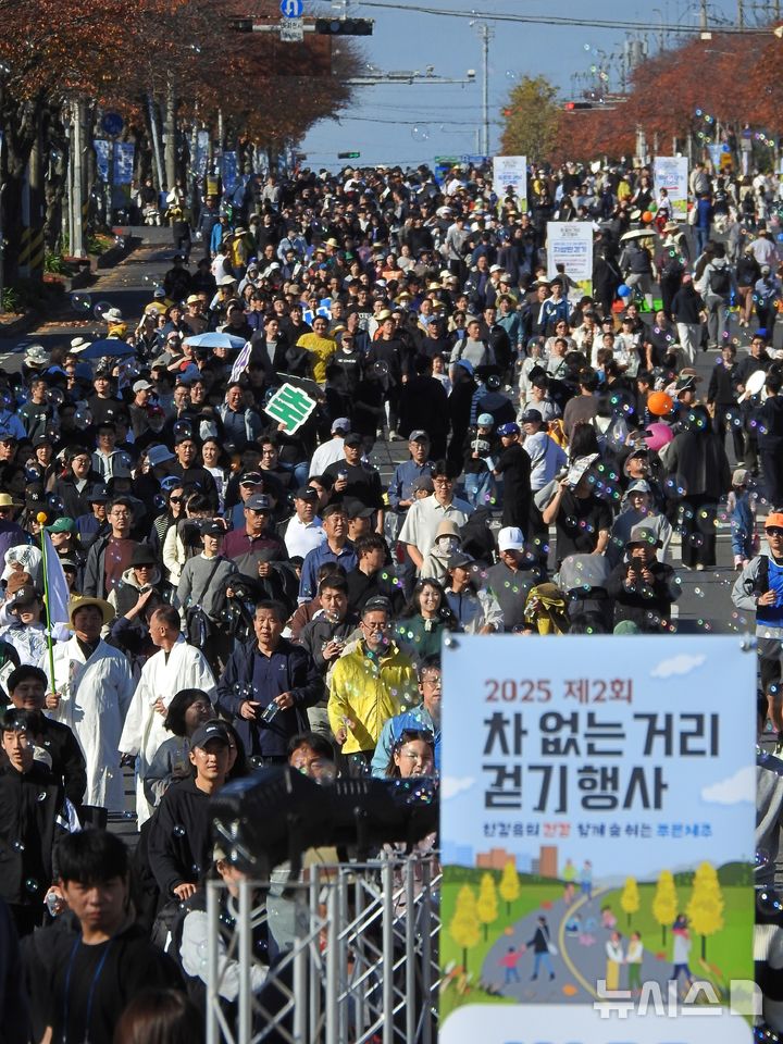[제주=뉴시스] 김수환 기자 = 30일 오전 화창한 날씨 속 제주 '2025 제2회 차 없는 거리 걷기행사'가 열린 가운데 참가자들이 차량 통행이 제한된 제주시 연삼로를 걷고 있다. 2025.11.30. [email protected]