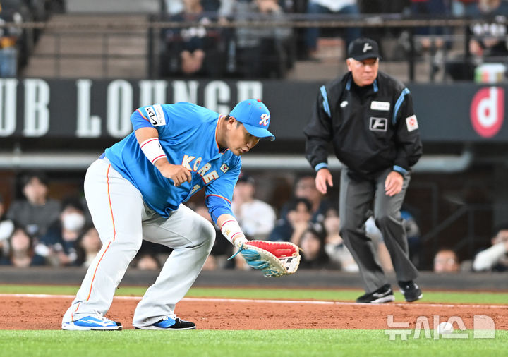 [서울=뉴시스] 사진공동취재단 = 30일 일본 에스콘필드 홋카이도에서 ‘한일 드림 플레이어즈 게임’이 열렸다. 이 게임은 한국과 일본 프로야구를 대표했던 스타들이 총 출동해 양국의 우정을 이어간다. 2회말 이대호가 이마에의 타구를 잡고 있다. 2025.11.30. [email protected]