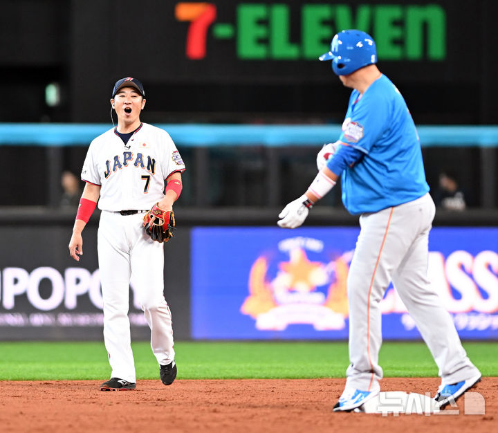 [서울=뉴시스] 사진공동취재단 = 30일 일본 에스콘필드 홋카이도에서 ‘한일 드림 플레이어즈 게임’이 열렸다. 이 게임은 한국과 일본 프로야구를 대표했던 스타들이 총 출동해 양국의 우정을 이어간다. 3회초 무사 1루 이대호의 2루타때 일본 2루수 니시오카가 놀라는 표정을 짓고 있다. 2025.11.30. [email protected]