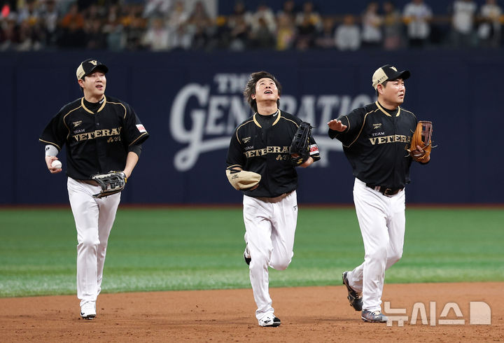 [서울=뉴시스] 김선웅 기자 = 30일 서울 구로구 고척스카이돔에서 열린 '더 제너레이션 매치 상상인메디카코리아' 팀 베테랑 vs 팀 라이징의 경기, 팀 베테랑 박건우, 박찬호, 양의지가 이닝을 마친 뒤 밝은 표정으로 더그아웃에 복귀하고 있다. 2025.11.30. [email protected]