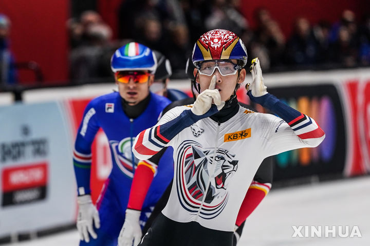 [도르드레흐트=신화/뉴시스] 임종언이 지난달 30일(현지 시간) 네덜란드 도르드레흐트의 스포르트불레바르에서 열린 2025-26 국제빙상경기연맹(ISU) 쇼트트랙 월드투어 4차 대회 남자 1000m 결승에서 1위로 골인한 후 세리머니하고 있다. 임종언은 1분25초877로 1위를 기록하며 금메달을 목에 걸었다. 2025.12.01.